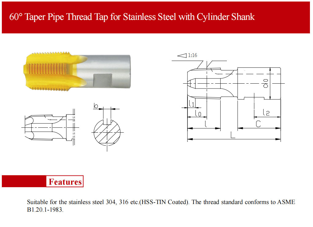 > 60° Taper Pipe Thread Tap for Stainless Steel with Cylinder Shank