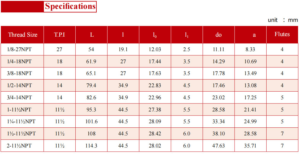 60° Taper Pipe Thread Tap HSS Bright-Low Hook for Cast Iron