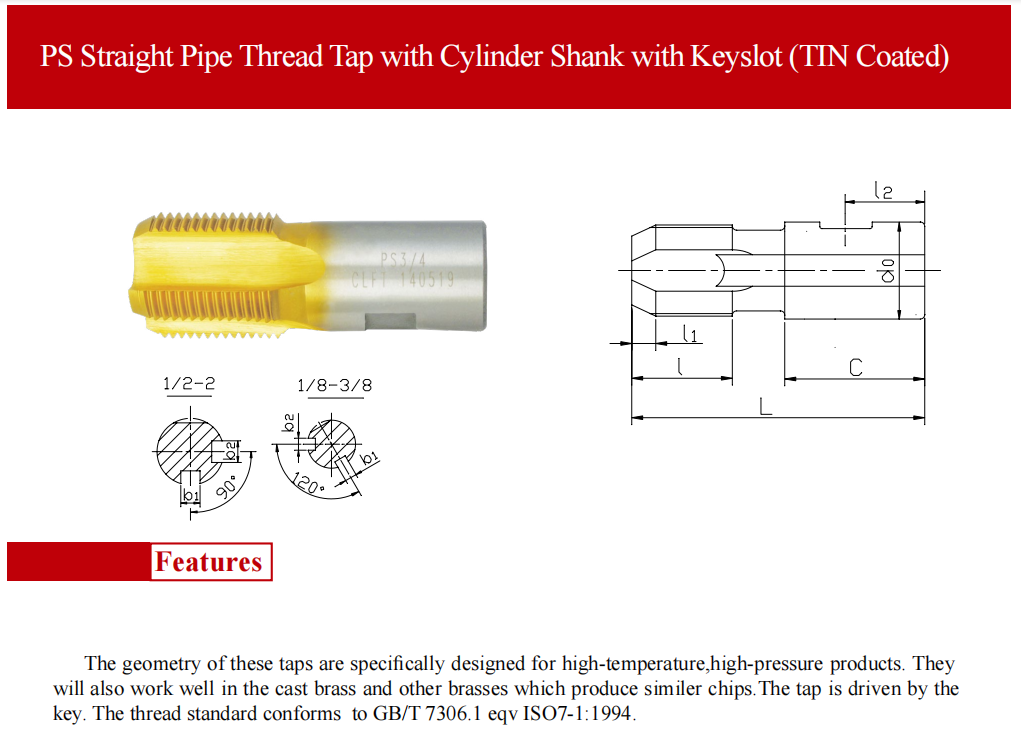 PS Straight Pipe Thread Tap with Cylinder Shank with Keyslot