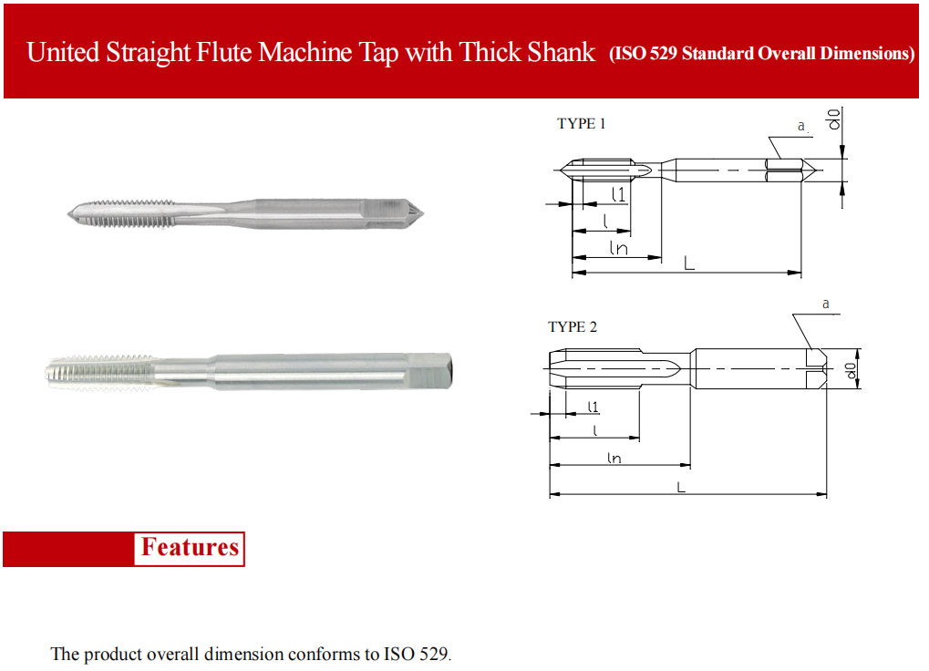 > United Straight Flute Machine Tap with Thick Shank (ISO529 Standard Overall Dimensions)