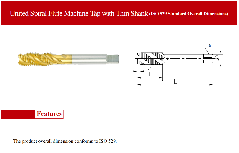 United Spiral Flute Machine Tap with Thin Shank (ISO529 Standard Overall Dimensions)