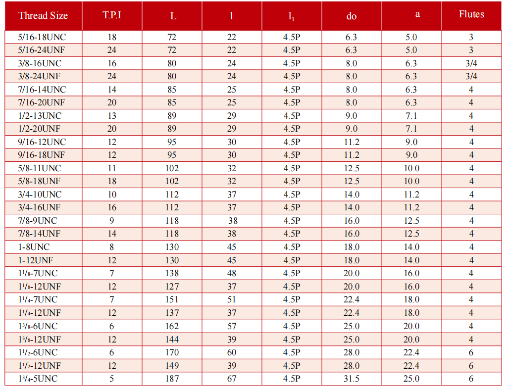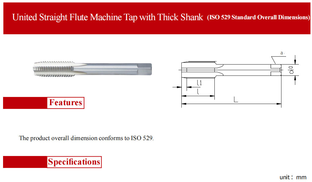 > United Straight Flute Machine Tap with Thick Shank (ISO 529 Standard Overall Dimensions)
