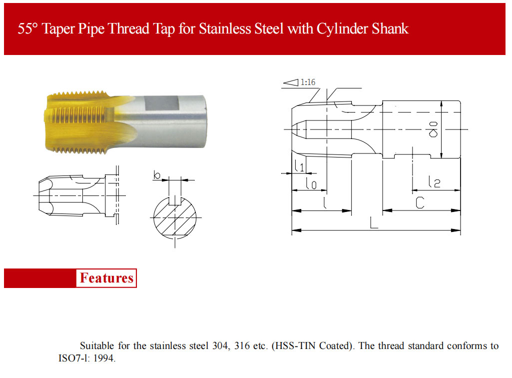 55° Taper Pipe Thread Tap for Stainless Steel with Cylinder Shank