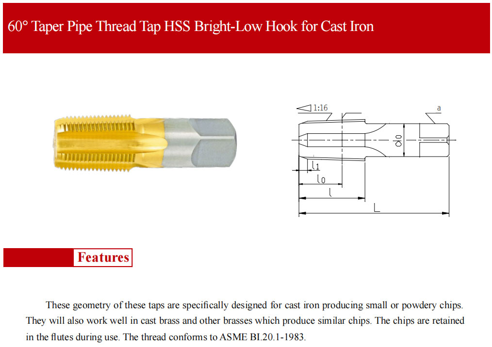 60° Taper Pipe Thread Tap HSS Bright-Low Hook for Cast Iron