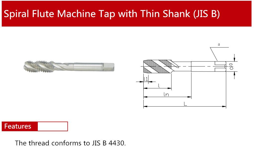 Spiral Flute Machine Tap with Thin Shank (JIS B)